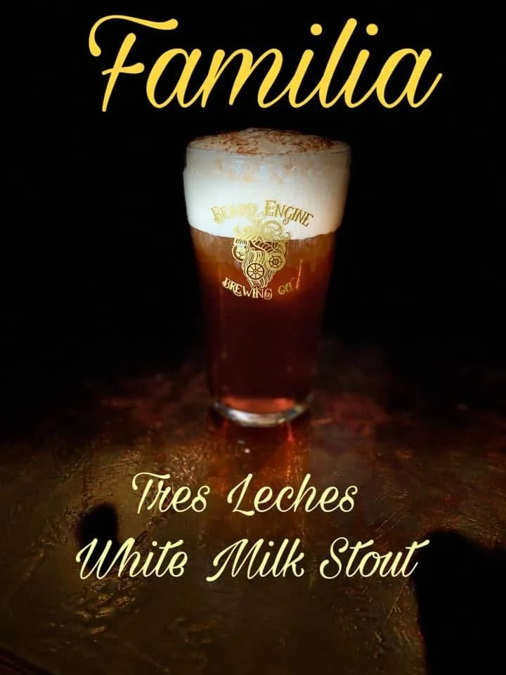 We pushed the limits for this beer. Golden Stout with huge additions of Ecuadorian cocoa nibs, star anise and Mexican coffee beans for that robust stout flavor. Vanilla, Lactose, and honey all come together for this rich decadent Stout which pay tribute to that wonderful Tres Leches dessert!